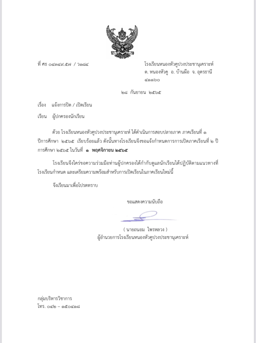 ประกาศวันเปิดเรียน ภาคเรียนที่ 2/2565